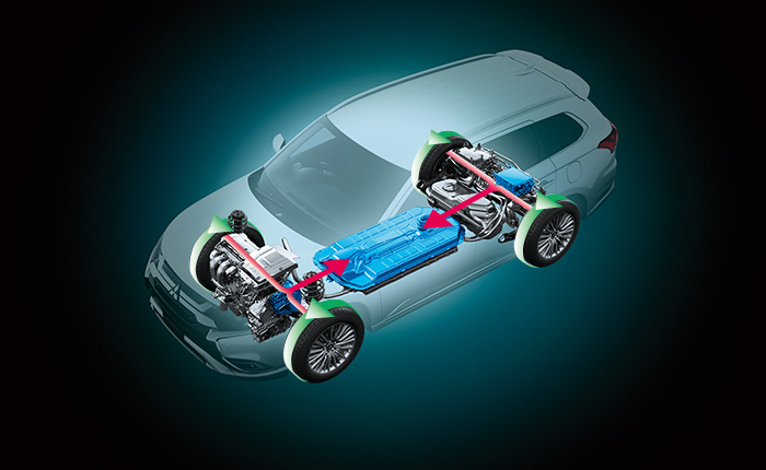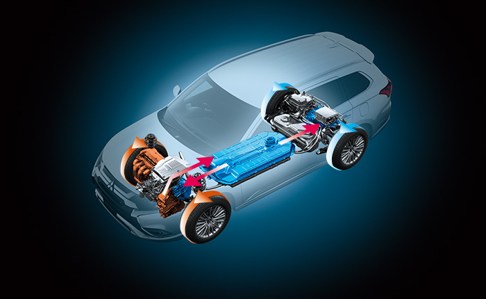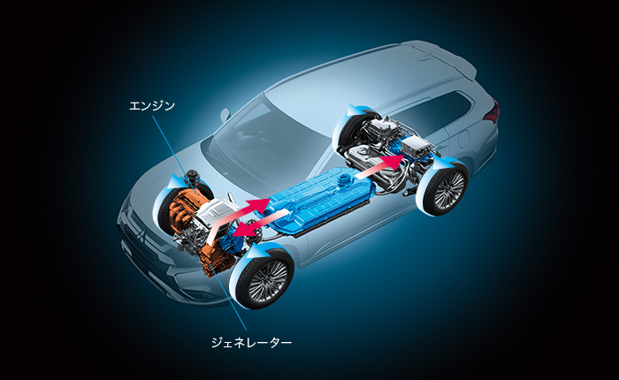 アウトランダーPHEVは、電気自動車ベースのPHEVシステムを採用。バッテリー容量が十分なときはEVで走行し、必要に応じてエンジンとジェネレーターがサポート。EV、シリーズ、パラレルの3つの走行モードを効率よく切り替えることで、長距離走行が楽しめます。